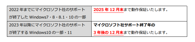 カロリーシリーズの動作保証期間につきまして、マイクロソフト社のサポート終了に合わせて内容を見直しましたので、