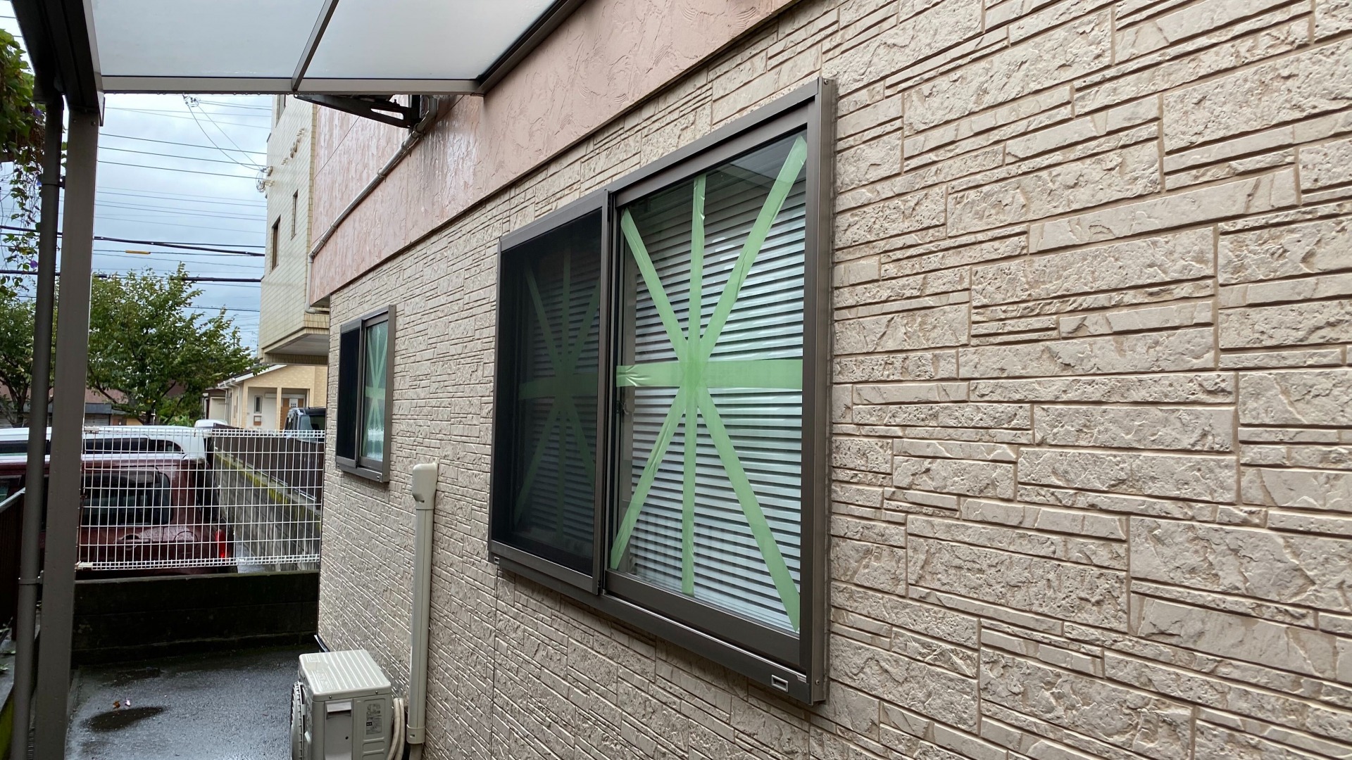 弊社もいつもの台風対策に加え、初めて窓ガラス飛散防止用に養生テープで対策を行いました。